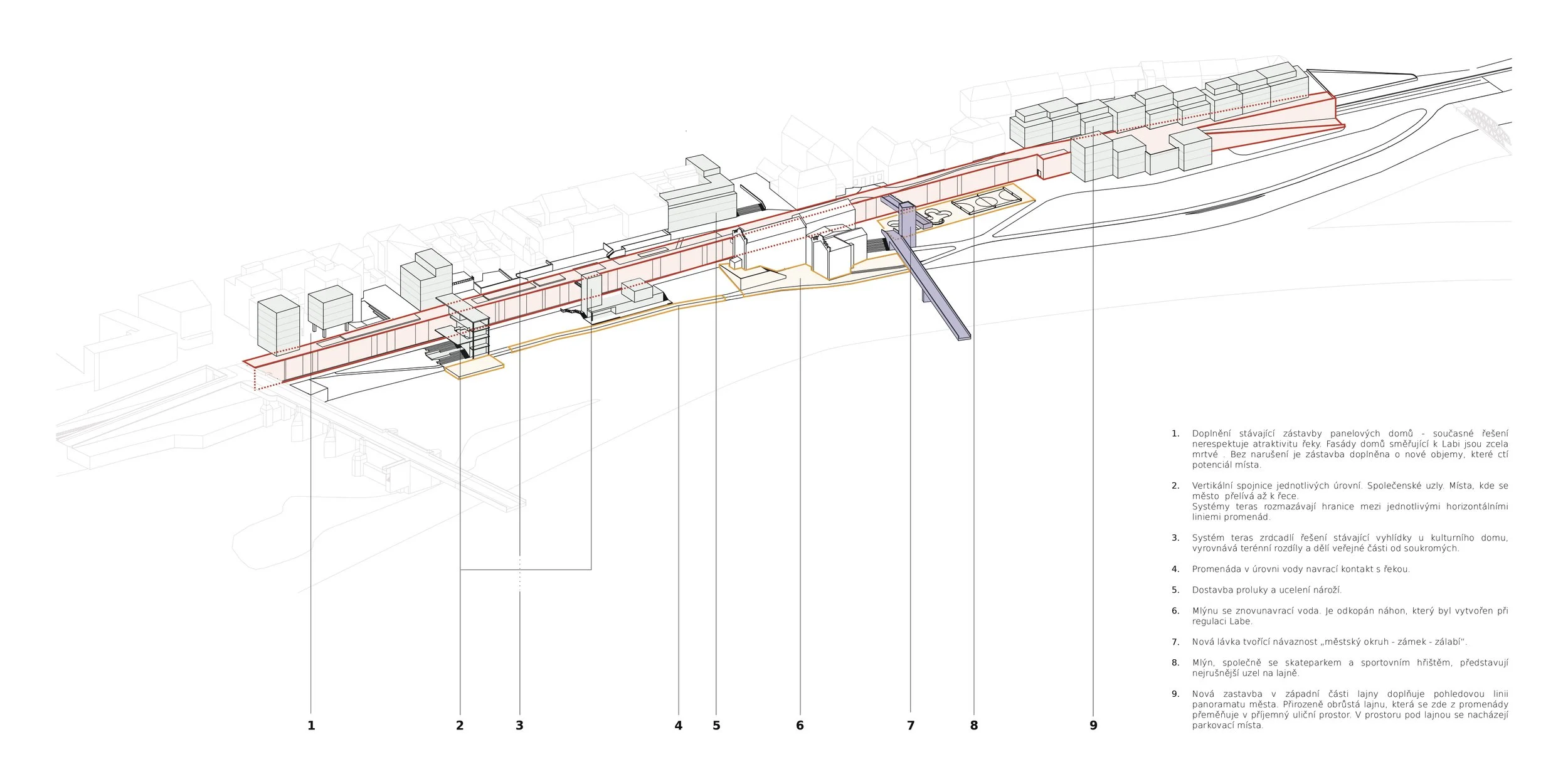 Řeka v Kolíně kdysi představovala život. Svou důstojnou pozici ve měste ztratila a hledá ji zpět. Město na řece vyrostlo, zásahem člověka se od ní však odvrátilo a pomalu začínalo vzdalovat. Zásadní bariéru netvoří morfologický zlom, ale železnice. Vlakový koridor je nedoléčenou jizvou způsobenou rukou člověka za průmyslové revoluce.Tvrdá výstavba železnice na levém břehu si v místě mězi městem a Labem vyžádala odlámání původní skály. Přírodní charketr zmizel, s ním i starší zástavba.